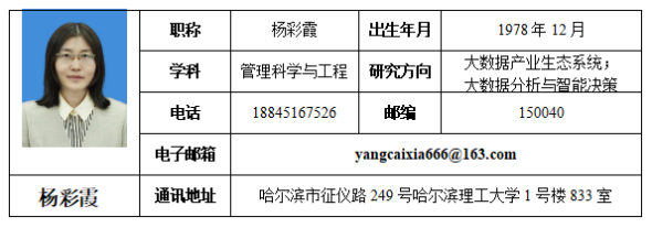 杨彩霞,管理学博士,博士后,副教授,硕士生导师。经济与管理学院信息管理与信息系统系党支部书记兼创新创业教育教研室主任,黑龙江省数字商务研究生工作站负责人。研究方向:大数据产业生态系统及数据治理,数智化转型,数字商务,创新创业教育。黑龙江省电子商务职业教育教学指导委员会委员。全国高校创业指导师,中国电子商务创业导师。中国技术经济学会技术孵化与创新生态分会理事,黑龙江省管理学学会理事,黑龙江省管理科学与工程学会理事,黑龙江省人工智能学会理事。黑龙江省电子商务协会常务理事、商务大数据分析专委会主任委员。黑龙江省电子商务专家,黑龙江省平台经济专家,黑龙江省工业和信息化厅专家。承担国家级及省级课题近20项,作为核心成员参与完成国家社科基金项目1项,主持完成省级项目4项。发表学术论文20余篇,出版专著1部,获省社科优秀成果奖2项,作为主笔人参与制定地方标准2项、政策2部,主持完成黑龙江省社科项目“黑龙江省大数据产业生态系统演化路径及发展对策”,2篇研究报告被黑龙江省商务厅采纳。