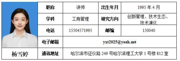 杨雪婷,博士,讲师,硕士生导师,研究方向:创新管理、技术生态、技术演化等。以第一作者或通讯作者发表中科院一区TOP期刊论文2篇(含ABS 3星期刊论文1篇);担任Technological Forecasting and Social Change、Humanities and Social Sciences Communications等期刊审稿人。