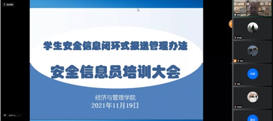 为提高经济与管理学院学生安全防范意识和安全预警能力,进一步加强学院安全稳定信息员队伍建设,贯彻落实校党委学工部《关于开展学生安全稳定信息闭环报送相关工作的通知》要求,11月13至21日,学院以年级专业为单位由辅导员老师召开了线上安全稳定信息员培训大会,学院党委副书记徐岩带头为96名研究生安全稳定信息员进行了学习培训,全体辅导员为500余名本科生学生干部、党员、安全稳定信息员进行了学习培训。