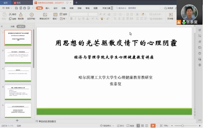 5月17日晚,为帮助学生克服由于封校产生的不适心理,维护学生的身心健康,学院邀请张泰复老师开展主题为“用思想的光芒驱散疫情下的心理阴霾”的线上心理健康讲座,共计800人参加本次线上培训讲座。会议上张老师详细讲述了疫情下学生发生的身心变化,针对目前的疫情形势、同学们的学习状态与生活状态进行了剖析。帮助同学们排解心理上的困扰,同时推广和宣传心理健康知识,增加心理健康意识与心理调控能力,加强疫情防控期间人文关怀与心理疏导,帮助同学们应对校园防疫期间可能产生的心理困扰。