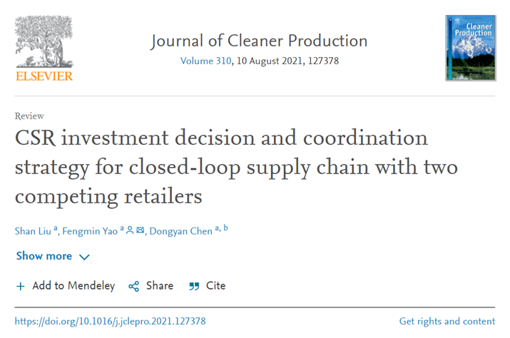 近日,我院博士研究生刘珊在国际权威期刊《Journal of Cleaner Production》上发表科研成果“CSR Investment Decision and Coordination Strategy for Closed-loop Supply Chain with Two Competing Retailers”(DOI:10.1016/j.jclepro.2021.127378)。该论文通讯作者为我院姚锋敏教授,理学院陈东彦教授合作参与研究。
