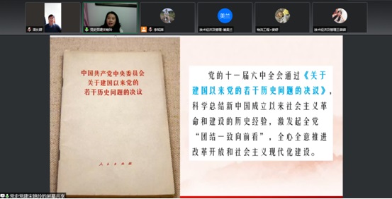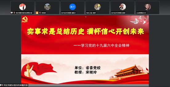 为深入学习宣传贯彻党的十九届六中全会精神,11月24日晚,经济与管理学院党委特邀黑龙江省委党校宋艳玲教授为学院全体教工党员和学生党员做以“实事求是总结历史,满怀信心开创未来”为主题的十九届六中全会报告会,报告会由学院党委书记周长群主持。报告会以视频会议形式召开,近400人聆听报告。