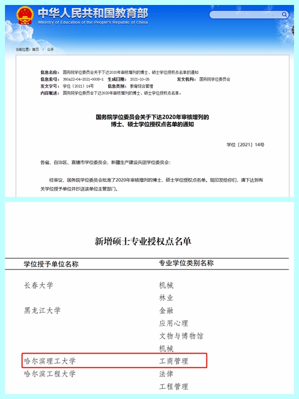 2021年10月,国务院学位委员会印发了《关于下达2020年审核增列的博士、硕士学位授权点名单的通知》(学位〔2021〕14号)。经国务院学位委员会审议批准,哈尔滨理工大学新增工商管理硕士(MBA)专业学位授权点。工商管理硕士(MBA)硕士专业学位授权点的重新获批,是学院不断加强学科内涵建设和优化专业学位布局,努力提高办学质量的综合体现,是学院继工程管理专业学位和会计硕士专业学位授权点之后的又一经管类硕士专业学位点,对学院学科结构和布局形成了有效均衡和补充,进一步完善了学院商科应用型人才培养体系,为龙江经济高质量发展输送德才兼备的管理专门人才。