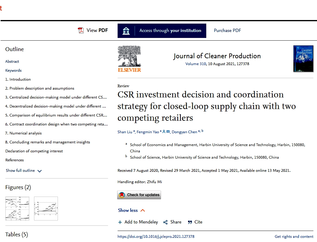 博士研究生刘珊在TOP期刊《Journal of Cleaner Production》上发表科研成果
