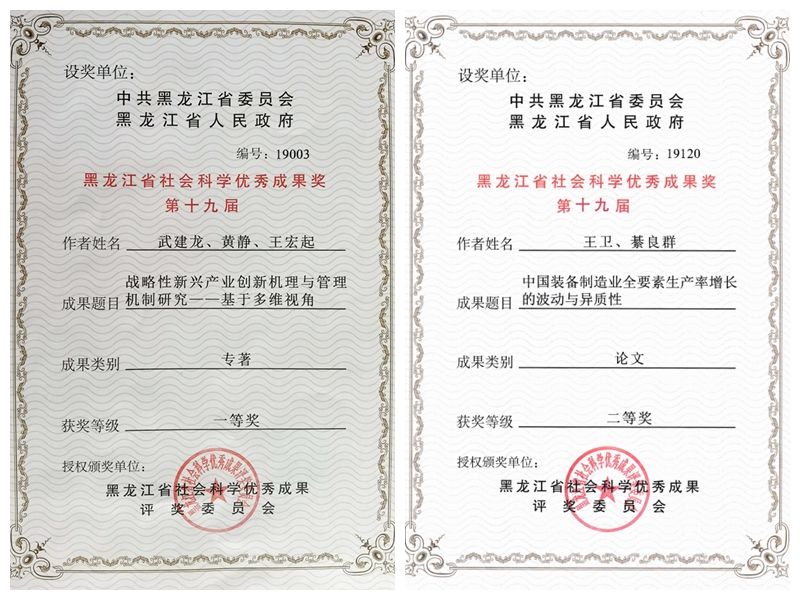 2021年11月26日,省科联九届二次全委会在哈尔滨召开,院长武建龙参加了会议,并作为黑龙江省社会科学优秀成果一等奖代表接受颁奖。这是继去年王宏起教授团队获得教育部人文社科类优秀成果三等奖之后产生的又一项高水平科研成果。一年来,学院教师坚持以服务经济社会发展为科研宗旨,充分发挥学院的学科及专业优势特色,围绕经济社会发展需要开展科学研究,获得国家级科研项目3项、省部级科研项目16项,在国内外期刊发表高水平学术论文44篇,在科学出版社等国家级出版社出版专著11部。省级重点培育智库“黑龙江省人口经济与人才发展战略研究中心”在考核中获评“良好”等级,科技创新和服务社会能力进一步增强。