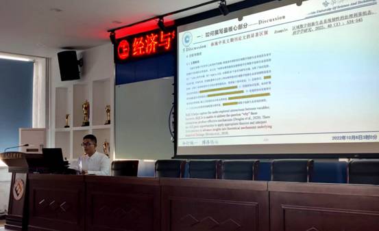 赵天一同学从选题背景和论文基本内容、组态思想与QCA方法应用、论文修改和发表经验三个方面展开分享,并阐述了引言、文献综述、讨论和贡献等部分的写作技巧和审稿重点。如,在引言部分,介绍了5C框架及其应用;在综述部分,指出了只综不述、全而不精、观点杂糅、缺少作者身影等常见问题及应对技巧;在讨论及贡献部分,通过对比中英文期刊的区别,阐述了Discussion的主要功能、Theory的多层含义、Contribution的类型及提升路径等。最后,赵天一同学分享了期刊选择、投稿、返修等环节的注意事项,并表达了对导师王宏起教授悉心培养的感激,以及对学院学科建设的良好祝愿。