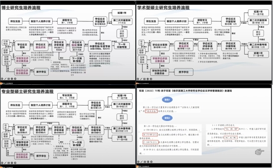 首先,王卫副院长强调了进一步规范和加强研究生培养流程管理以及健全关键环节质量监控体系的重要性。其次,王卫副院长通过清晰直观的流程图,结合学校及学院的相关政策文件,分类别地讲解了博士研究生、学术型硕士研究生、专业型硕士研究生的培养流程。从师生互选、制定个人培养计划、课程学习、学位论文的开题、中期考核、预审预答、评审、答辩到学位评定委员会学位授予全过程关键环节,结合校发[2022]51号关于印发《哈尔滨理工大学研究生管理规定(修订)》的通知、校发[2022]75号关于印发《哈尔滨理工大学研究生学位论文评审管理规定》的通知、经管政发[2022]17号《哈尔滨理工大学经济与管理学院研究生学位论文评审管理办法(修订》等文件,对各个环节的时间节点、具体要求,逐一展开了详细讲解。