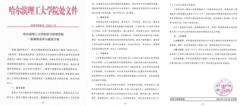 按照新文科建设关于课程创新改革的要求,为提高课程的高阶性、创新性和挑战度,体现数字技术重塑课程体系,筹备23版培养方案修订工作,2022年4月,学院发布了《哈尔滨理工大学经济与管理学院一流课程改革与建设方案》。截至到目前,学院已完成三个批次的一流课程申报评审工作,支持新增或升级改造本科课程共计40门,课程类型涉及各专业核心课、专业选修课以及实践实训课等,为重塑23版培养方案的一流课程体系提供了重要的支撑。