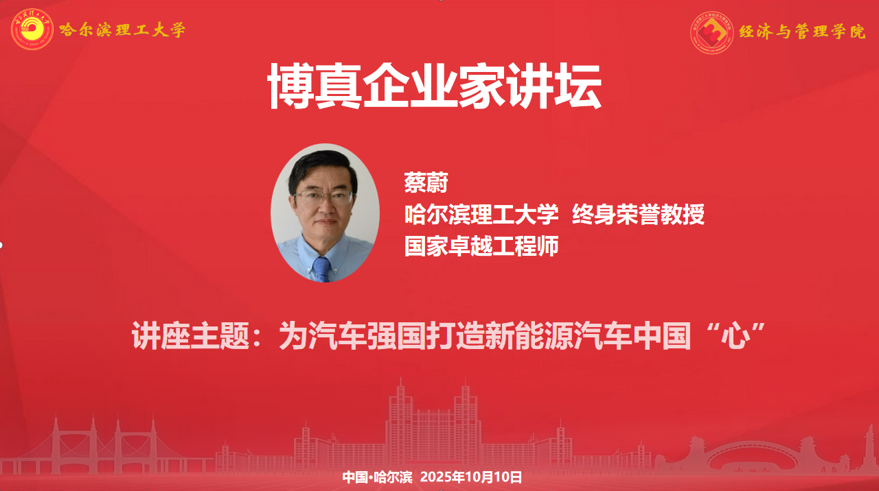 为加强学院学科专业建设,拓宽MBA学员视野,2025年10月10日上午9:00,经济与管理学院邀请哈尔滨理工大学终身荣誉教授、国家卓越工程师获得者蔡蔚教授作题为《为汽车强国打造新能源汽车中国“心”》的主旨讲座。经济与管理学院院长王莉静,MBA教育中心副主任于金闯,2025级非全日制MBA、MEM专业研究生参加讲座。讲座由王莉静院长主持。