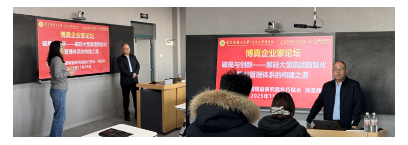 2025年11月28日,哈尔滨理工大学经济与管理学院“博真企业家论坛”如期举行,特邀万达控股集团精益研究院执行院长闫圣利作专题报告,讲座由学院副院长孙嘉轶主持。围绕“破局与创新—解码大型集团数智化精益管理体系的构建之道”这一主题,闫院长结合丰富的企业实践与系统化的战略思考,为师生奉上一场视野宏阔、逻辑严密、案例鲜活的高质量学术分享。