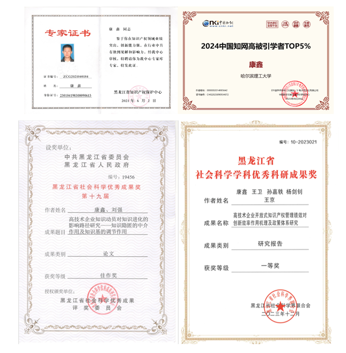科研上,康鑫教授在高新技术企业知识管理、技术创新管理以及知识产权管理等方面进行了深入的研究,作为项目主持人主持国家哲学社会科学基金2项、中国博士后科学基金1项、黑龙江省哲学社会科学专题重点项目1项、黑龙江省哲学社会科学规划项目2项,黑龙江省自然科学基金1项,山东省重点研发计划(软科学)项目1项,参与完成其他项目多项。以第一作者在《南开管理评论》《科学学研究》等国内外重要期刊发表学术论文近30篇,出版学术专著及教材4部,获得省级、厅局级各种奖项6项,展现了其在科研领域的建树。