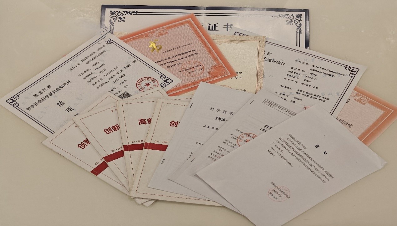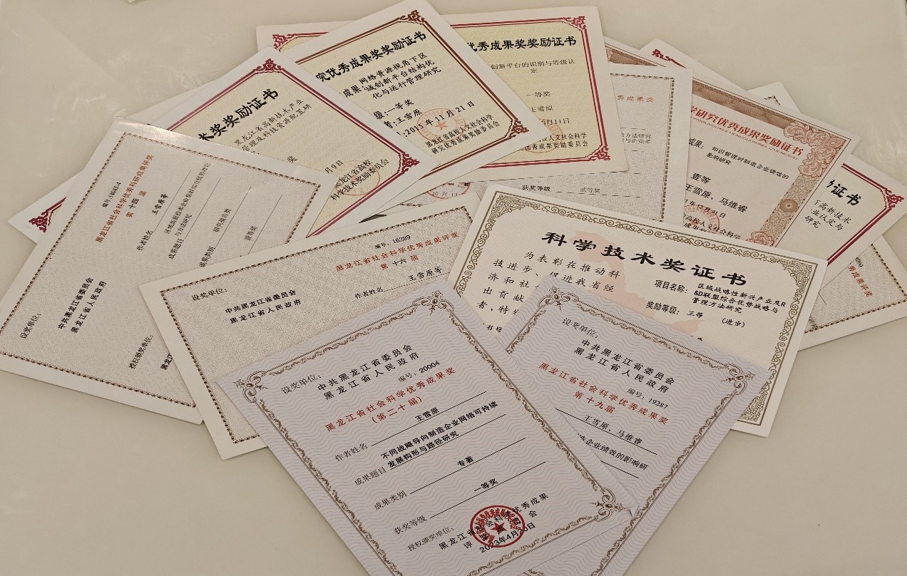 凭借扎实的研究成果,获省部级奖励10余项,包括黑龙江省社会科学优秀成果一等奖、黑龙江省社会科学优秀成果二等奖、黑龙江省科技进步二等奖、黑龙江省科技进步三等奖、教育部高等学校科学研究优秀成果奖三等奖等省部级奖励。